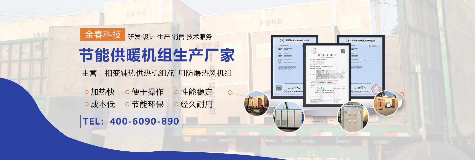 本公司專業(yè)生產(chǎn)相變輔熱供熱機組、礦用防爆熱風機組,可代替燃煤、燃油、燃氣鍋爐,運行成本低,具有加熱快、熱效率高、便于操作,節(jié)能環(huán)保等特點,是新一代理想的環(huán)保節(jié)能產(chǎn)品。